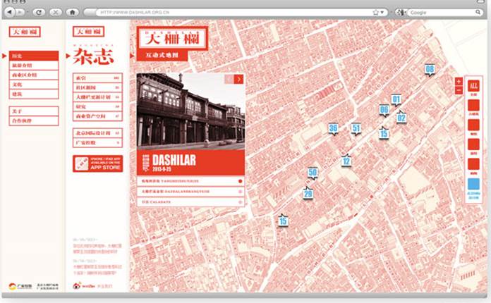 大柵欄官方網站于2014年6月正式對外運營,網站單日訪問量最高為9000次,設計周期間總訪問量高達33.8萬次,大柵欄網站憑借其獨特精美的設計榮獲2014紅點獎傳播設計獎。