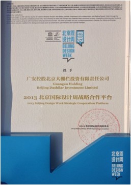 2013年10月24日下午,大黃鴨北京告別會暨“為愛而設計”公益活動頒獎典禮在頤和園舉行。設計周組委會向今年北京國際設計周期間表現卓越的機構與設計師頒發獎項,廣安控股大柵欄投資有限責任公司榮獲北京國際設計周戰略合作平臺獎,大柵欄更新計劃獲得2013北京國際設計周最受媒體歡迎獎,大柵欄領航員計劃中微胡同、老張的年畫、一勺子糖、胡同廁所等諸多項目分別獲獎。