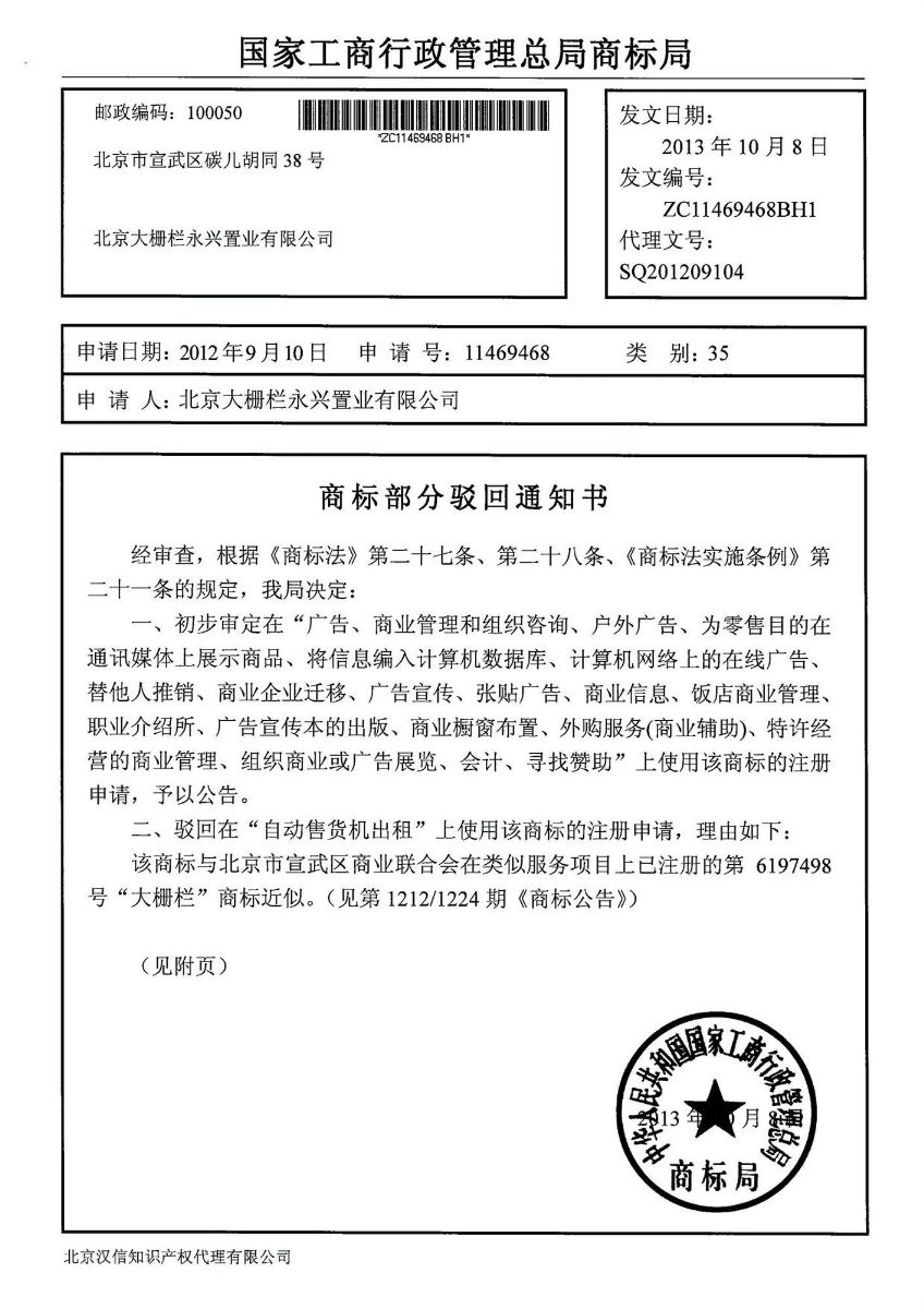 在永興置業(yè)申請的35類注冊“大柵欄圖形”商標中除“自動售貨機出租”這一項駁回,其余20項(1、廣告;2、廣告宣傳;3、計算機網(wǎng)絡(luò)上的在線廣告;4、戶外廣告;5、廣告宣傳本的出版;6、商業(yè)櫥窗布置;7、為零售目的在通訊媒體上展示商品;8、張貼廣告;9、商業(yè)信息;10、組織商業(yè)或廣告展覽;11、飯店商業(yè)管理;12、外購服務(wù)(商業(yè)輔助);13、商業(yè)管理和組織咨詢;14、特許經(jīng)營的商業(yè)管理;15、替他人推銷;16、職業(yè)介紹所;17、商業(yè)企業(yè)遷移;18、將信息編入計算機數(shù)據(jù)庫;19、會計;21、尋找贊助)已經(jīng)通過初審。