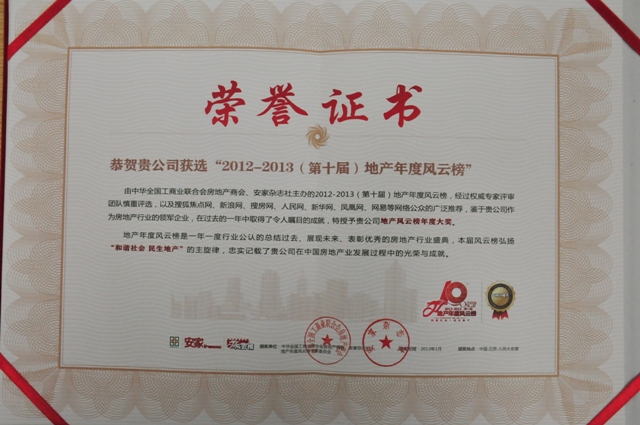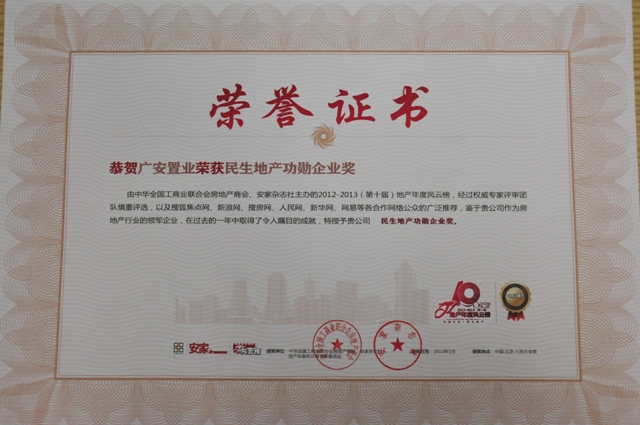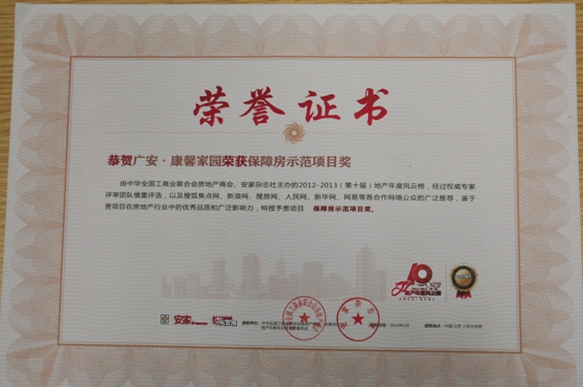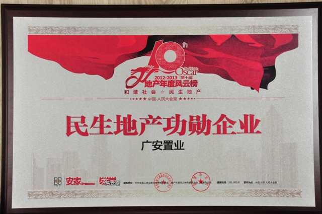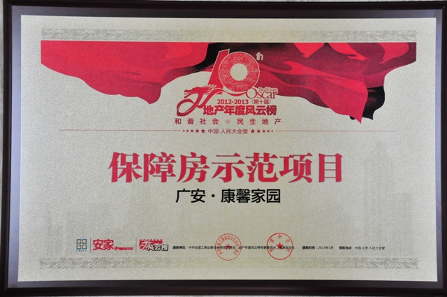 2013年1月18日,從全國工商聯房地產商會主辦的中國房地產業“2012-2013地產年度風云榜”頒獎盛會上傳來喜訊,北京廣安置業投資公司及廣安·康馨家園項目雙雙入選“2012-2013(第十屆)地產年度風云榜”,置業公司喜獲2012-2013“民生地產功勛企業”、廣安·康馨家園項目獲得2012-2013“保障房示范項目”榮譽稱號,這是置業公司在2012年度所獲得的又一大獎,也是對公司及全體員工一年來的辛勤工作的肯定和鼓舞。此次盛會已經引起了國內房地產行業眾多公司及知名行業人士的關注和參與,全國300多家媒體對此次盛會進行了跟蹤報道。